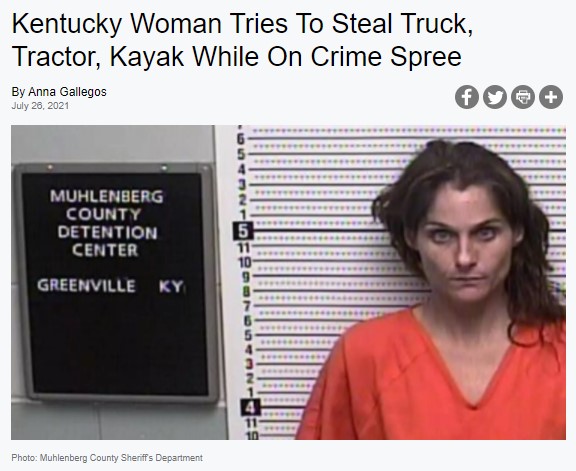 According to the report (See Above) Ms. Duncan broke into three houses in Greenville, KY. While at the last house she found a truck she absolutely could not live without. She fired it up, crashed through a garage door and went “muddin” until burying the thing in a field on a nearby farm. She bailed on the truck and tried to steal a kayak to escape and evade capture via a small creek. Some how the kayak thwarted her attempted theft where the truck did not. Not to be deterred, she found a shiny green John Deere tractor. Despite not knowing how to drive a kayak, she successfully made off with the tractor. Until that is she dropped the bucket and ground through three driveways before crashing the big green tractor into a culvert.